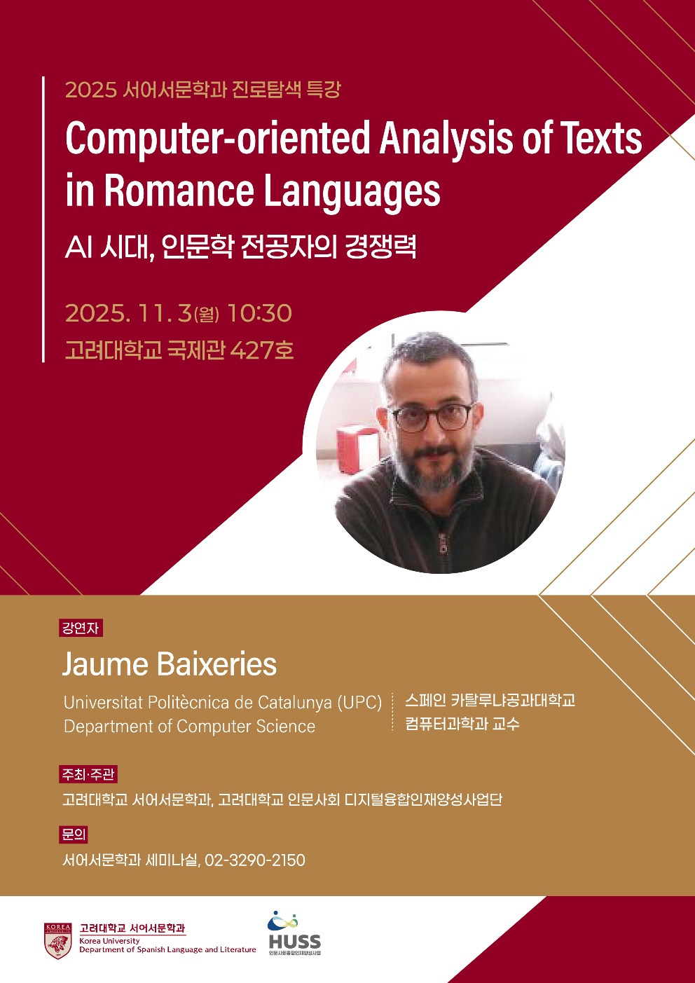 Computer-oriented Analysis of Texts in Romance Languages - AI 시대, 인문학 전공자의 경쟁력 일시: 2025. 11. 3(월) 10:30 장소: 고려대학교 국제관 427호 - 사전 Q&A (미리 교수님께 드릴 질문들을 받고 있습니다! 각자 1-2개씩 질문 부탁드립니다) 서문과 학생 여러분의 많은 관심 바랍니다.